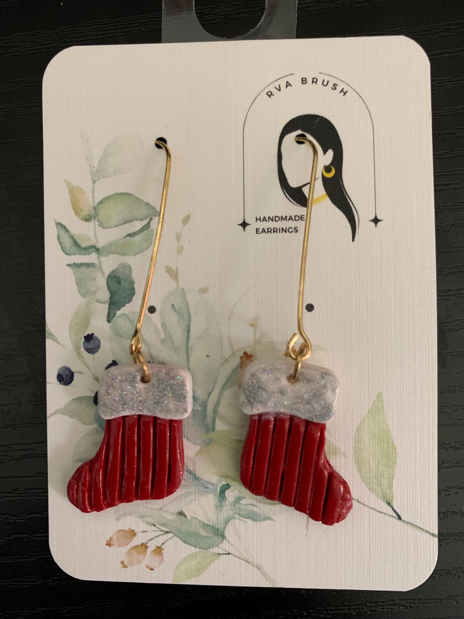 Bring festive cheer to your holiday season with these handmade polymer clay Christmas stocking earrings. Each stocking is crafted in vibrant red with a textured finish and topped with a sparkling silver cuff for a touch of shimmer. The lightweight design ensures all-day comfort, while the gold-tone ear wires add a warm, elegant accent.