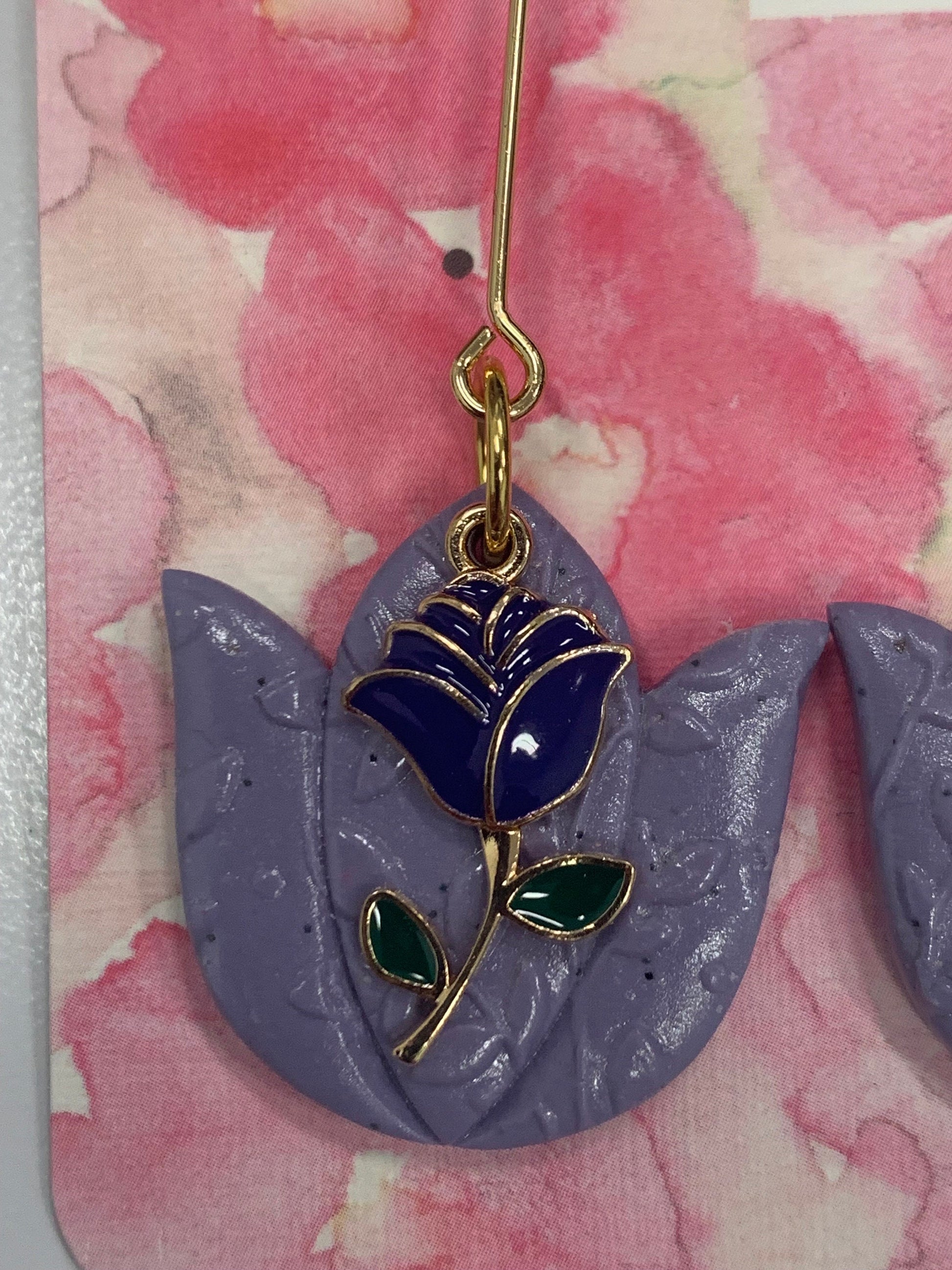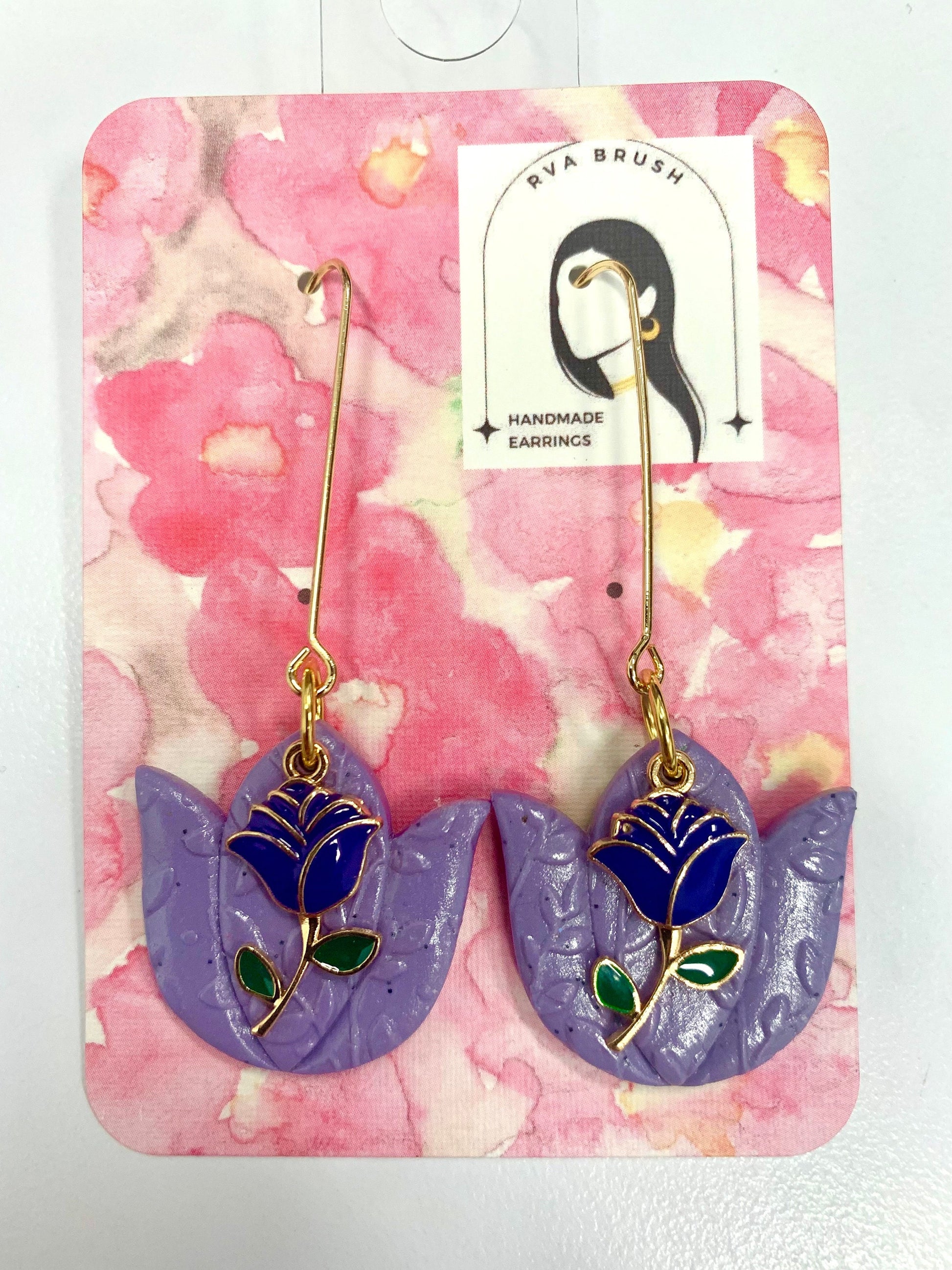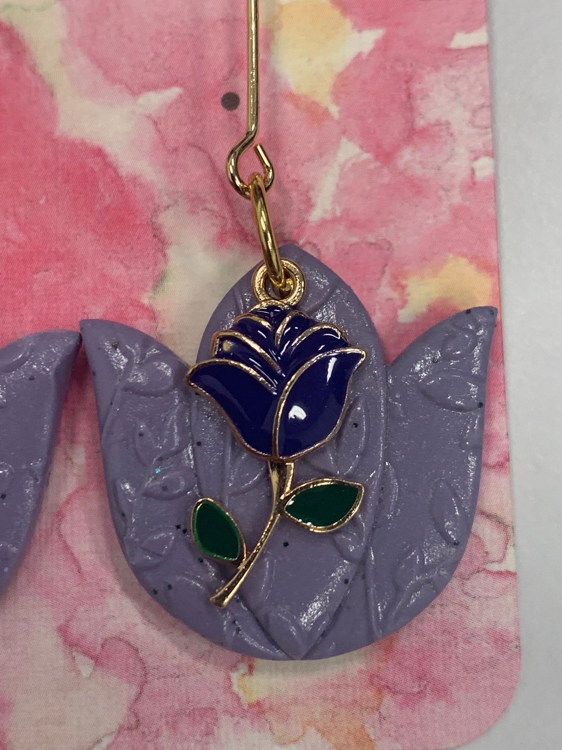 Add a touch of elegance and uniqueness to your jewelry collection with these exquisite handmade lavender rose earrings. Crafted with care and precision, these earrings feature a beautiful lavender base adorned with an intricate blue rose design, accentuated by green leaves. The delicate floral motif is set against a soft, textured background, making these earrings a perfect accessory for any occasion.